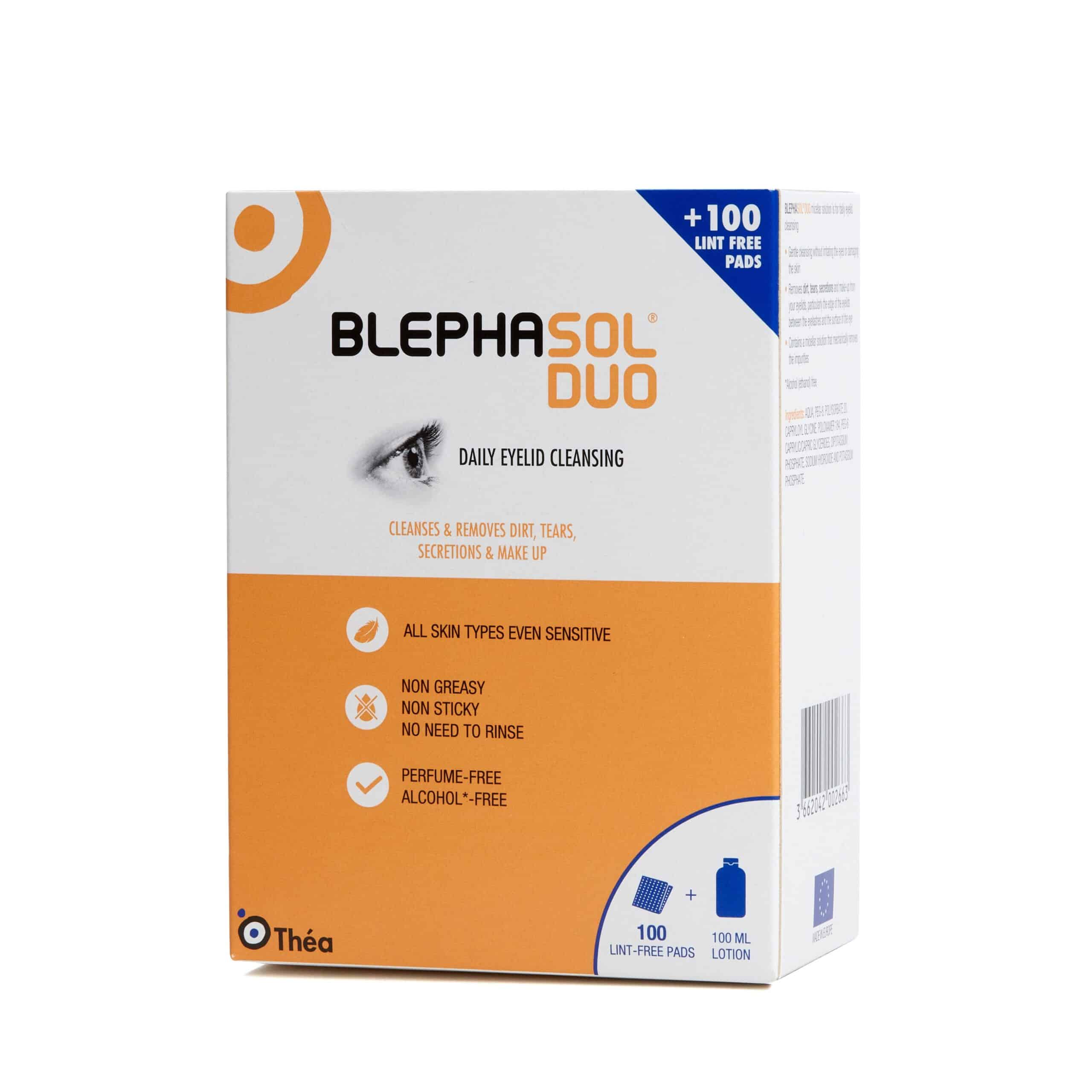 Blephasol Duo supplies a gentle cleansing solution alongside sterile pads for effective lid hygiene.